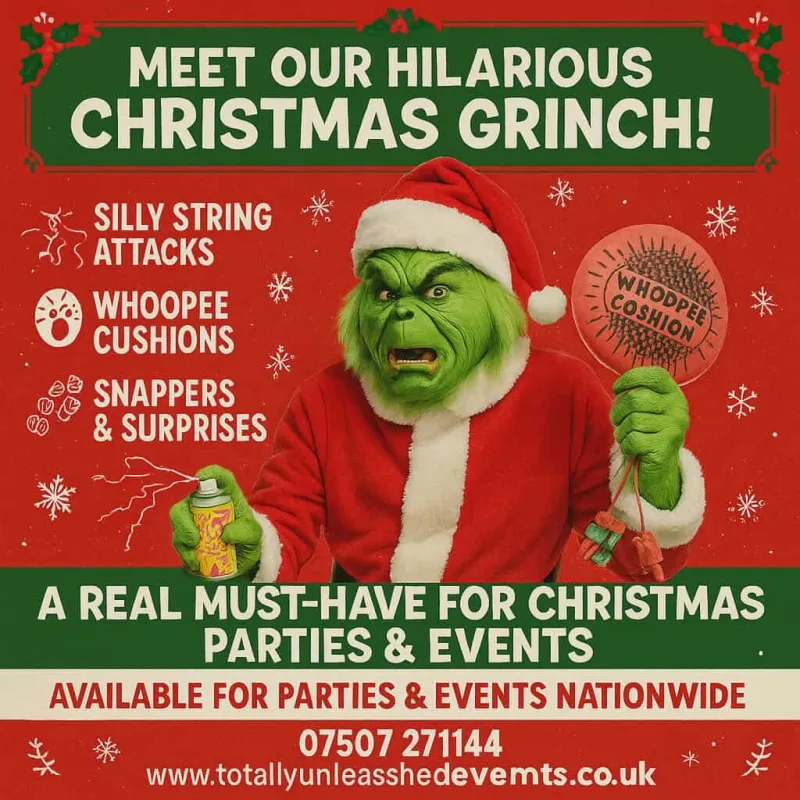 Looking for something a little different to make your Christmas party unforgettable? Our hilarious Grinch character is here to bring fun, mischief, and laughter to your festive celebrations!